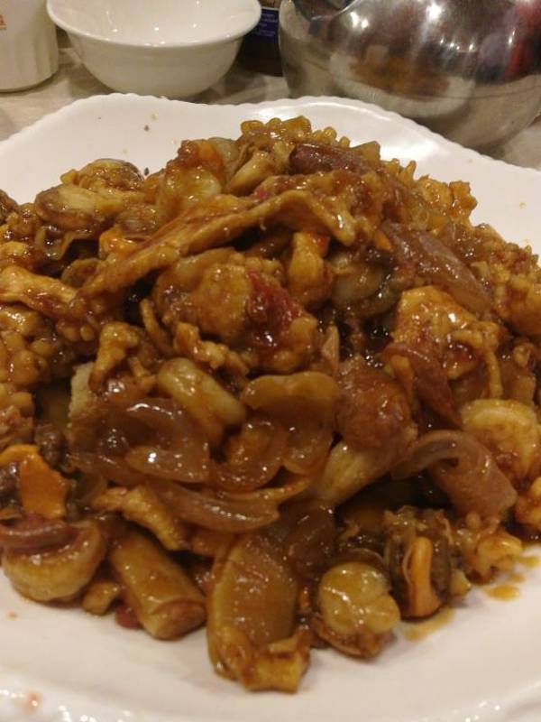 染完头发出来吃个饭,就近选了这边。据说以前还有外卖档口,和周边的华昌不相上下。津菜,做菜,明油亮芡绝对是这边的风味。饭店过来食客很多,基本上是周边的居民吧。上菜速度还挺快,菜量很小,盘子上都贴着厨师编号,传统店貌似都有这个规矩。杏鲍菇牛柳,48米。杏鲍菇切条和牛柳一起爆炒,加了洋葱和青红椒增香,牛柳不太好嚼哈,觉得肉不是特新鲜,而且略咸。川府鸡片,28米。用水煮牛肉的方法做了鸡肉片,肉质香嫩,而且麻辣味儿不是太重,垫底的金针菇和豆芽菜也都可以愉快的一口接一口。津门爆鱼虾,48米。鱼肉丁和虾仁都裹了面糊炸制,然后用木耳,洋葱和青红椒爆炒,咸鲜口味,配饭吃还不错。酸辣汤,小份12米。小份4-5个人完全没问题哈,加了豆腐丁喝起来软滑酸辣。白饭是服务员拿着小桶过来给乘在碗里的,很瓷实。适合家庭聚会的小馆,环境中式,楼上有包间可以提前预订。