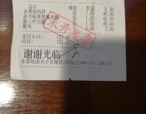 菜好 人差 不给开发票 有偷税漏税的嫌疑。。。。。。。 打车来了 不远12元车费 就在路边 很好找 餐厅不太大 有上下二层 有包间 七拐八拐的 楼上有卫生间 看菜单有四五页菜谱 价格适中 都是当地菜点了甜桃嫩鸡柳 又舔又酸 量中等 黄焖二样 是牛肉和面筋 颜色一班 有点黑 味道好吃量中等 还点了八珍豆腐 这个菜好吃 量大 里面有鱿鱼 仙贝 虾仁 炸豆腐 玉兰片 海参 蟹棒 味道好 去晚了要排队 人多啊 总的来说挺好吃的 这是第一顿天津饭 晚上再报道新餐厅啊。。。。。。重点说一下 这家不给开发票 说要等十五天才能开 如果是旅游的客人 能等吗?明显是偷税不想给开发票。差差差。