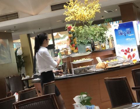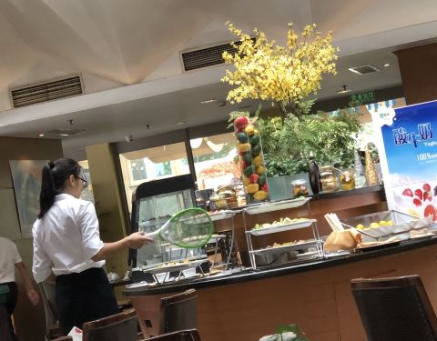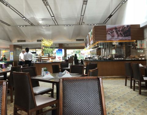 老牌饭店的咖啡厅,在一楼花园边,环境还行,自助餐除了牛排、冰激凌可以吃,其他都soso,有三文鱼刺身,一个塑料长盒子里放满了冰块,刺身就放在冰块上,三文鱼刺身的口感很差,我没让孩子们吃,还有最主要的是服务员拿着电蚊拍在赶飞虫,让我一点食欲也没有了