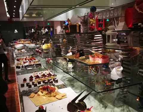 【位置】 江宁,导航过去,位置准确。 周末的地下停车场简直太可怕了,全是车在里面绕,停车场里堵车,有位子全靠运气,后面进来的车都被保安疏导出去了,让停景枫去。 停了1个多小时,收了8元,不算贵。在自助收费机上交费,然后可以查询到车子停的具体位置,这点还是很赞的。 【环境】 电梯到5楼,出来左边是西餐厅,正前方是中餐厅。(有一半电梯是不到地下停车场的,必须到1楼中转) 进门左边是一巨大的姜饼屋,右边是熬糖的台子,服务员在做糖金桔,哄孩子们玩。 洗手间在正对面,设施很好,卫生状况不太好,估计是服务员忙不过来。 餐厅设计得不错,看上灯光明亮又温馨,座位很舒适。 落地大玻璃窗,可以边吃饭边欣赏夜景。 【服务】 需要提前一天预订座位,周末去的时候,客满哦~ 只有自助晚餐,没有午餐,17:30-21:30。 落座会把桌上的小火锅添汤,有辣、不辣两种口味可选,2人一份海鲜拼盘,其他的食物就自取了。 服务员人数严重不足,只能满足基本需求,桌子上的盘子、杂物基本来不及收拾,自己给挪到别的吃完的桌子上去。 服务态度还是很好的,在能力范围内都能有求必应,遇到一个孩子把甜品台掀翻了,服务员、经理第一时间跑过去查看孩子伤情,也没有要求家长赔偿损失,有五星酒店的气度。 不提供停车券。 原价是158一位,促销活动时买的,买一送一,相当划算。 【食物】 给的那个海鲜拼盘,有蟹腿、龙虾、扇贝、牛肉等,分量很足,我看好多桌都没吃完(必须现场吃,不给打包),哈哈哈哈哈哈~ 最赞的是刺身,大部分时间都有师傅在现切,拿的客人不算多,不用抢,基本随时可以吃到。有三文鱼、鲔鱼、鲷鱼等好几个品种,品质都很好,新鲜美味,一点不腥气,口感也很好,吃得甚为满足。 第二赞的是烧烤,一位大姐在现烤,品种特别丰富,鱼、虾、田螺、生蚝、扇贝、鸡翅、羊肉串等轮番烤,大姐的手艺好,味道很好,还挺幽默,喜欢跟等候的客人聊天,等的时候一点都不无聊,哈哈哈哈哈哈。 其他,凉菜、热菜、炖菜、甜品等,没有特别出彩的。 【评价】 停车场太小,饭点停车很困难,环境不错,服务一流但是人员不足,自助餐的品种不算多,亮点在于海鲜拼盘、刺身和烧烤,所以有这三样也妥妥能把人撑掉,性价比还是很不错的。
