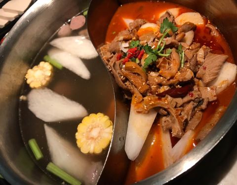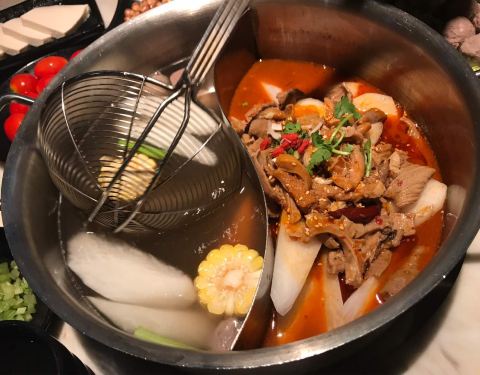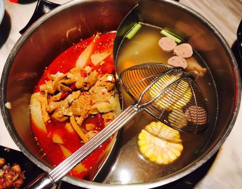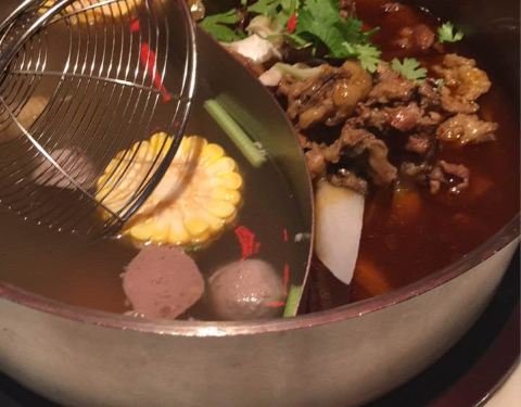 - 吃了牛杂鸳鸯锅,觉得不错,牛杂特别软,十分好吃。潮汕口味火锅。另外,还有番茄和黄瓜吃