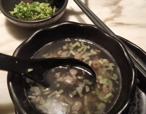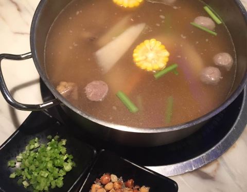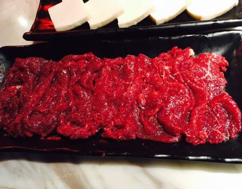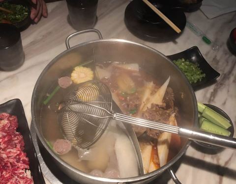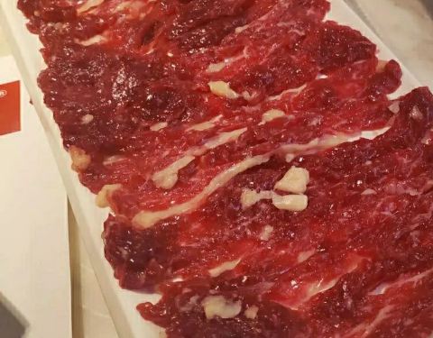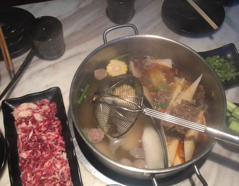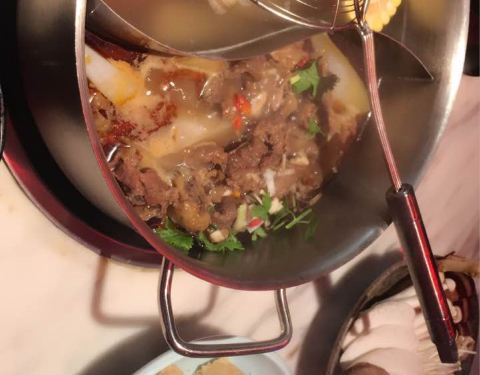 清汤锅,里面有几块小牛肉,汤很鲜美,点了嫩牛和吊龙,切片碎了点,其他都挺满意的。