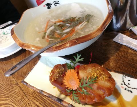 松鼠鱼造型很别致,和糖藕一样比较甜,偶尔品尝一下还不错;莼菜银鱼羹很好喝