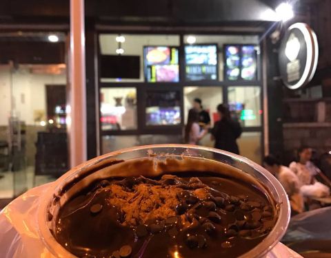 想吃刨冰就过来了,可以堂食,店门口摆放了几张小桌子,还是露天吃带感呀,但不是很好停车,索性买了一份带走。 超级巧克力,是奶冰 巧克力酱 巧克力豆组成,酱很浓,有一种小时候吃的巧克力冰棍儿的味道,挺怀旧...