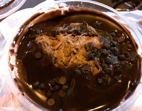 想吃刨冰就过来了,可以堂食,店门口摆放了几张小桌子,还是露天吃带感呀,但不是很好停车,索性买了一份带走。 超级巧克力,是奶冰 巧克力酱 巧克力豆组成,酱很浓,有一种小时候吃的巧克力冰棍儿的味道,挺怀旧的,当然要配着酱吃才好吃呀,很大一份,挖了几勺,酱就有些不够了,可以点双料就好啦~