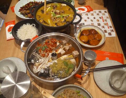 鱼头王挺不错的,鱼肉鲜嫩,辣椒不是很辣,加上一份手擀面进去非常好吃。山珍土鸡,鸡肉有点硬,不过汤非常鲜,而且不油腻,很满意。石磨豆腐,土豆丝一般,酒酿圆子,冰冰的,酸酸甜甜,好喝。