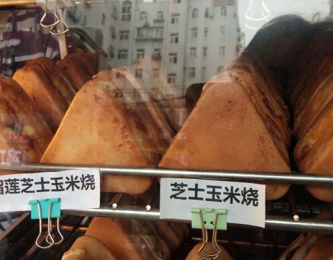 这个这个这个。超级好吃呐,以为是像鲷鱼烧那个样子,也差不多。热腾腾的捧在手上,外皮酥软,馅儿浓稠。我买了芝士榴莲的,芝士很足很足,榴莲味道也很浓烈,还有很多玉米,非常满意特别开心啊。下次来还要吃。就是¥。15价格稍微贵一些不过真的很值。地理位置也蛮好找的,就在那一天街上,牌子是绿色的,很醒目。