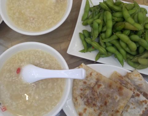 清粥就着肉饼次,清淡不油腻~毛豆清爽味道合适,店内冷气超足(∩_∩)