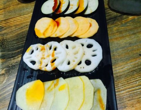 还是烤肉最美味,炸蔬菜必须要赞一个,比以前吃过的炸蔬菜都要好吃,菜的块头很大,并且还炸熟了,红薯很多