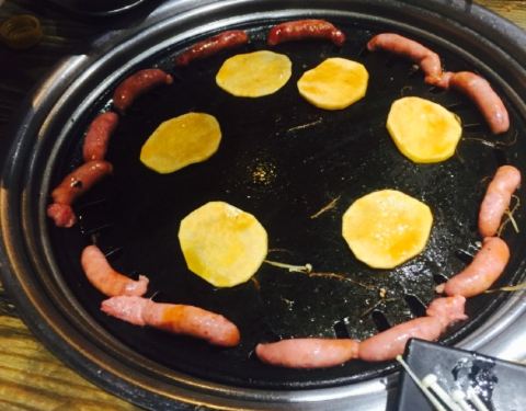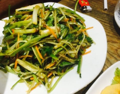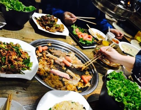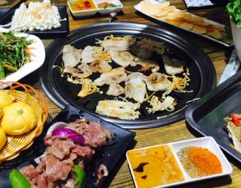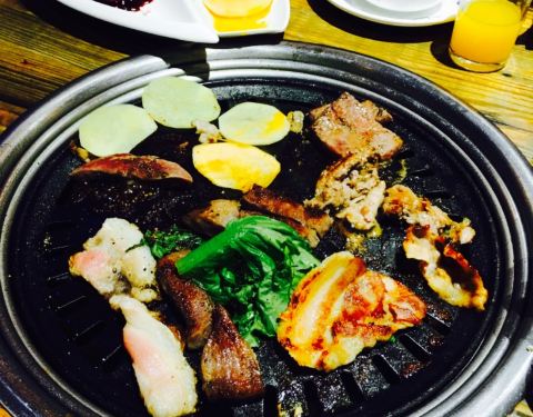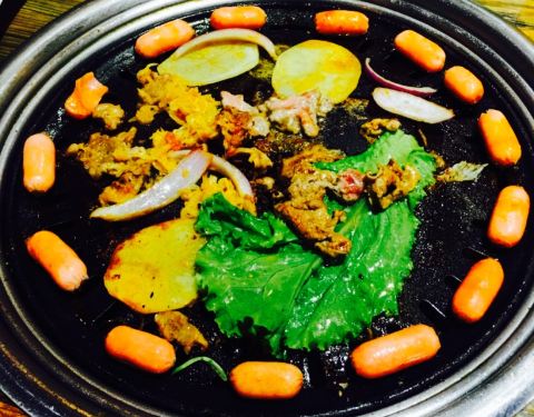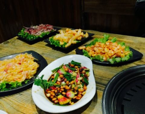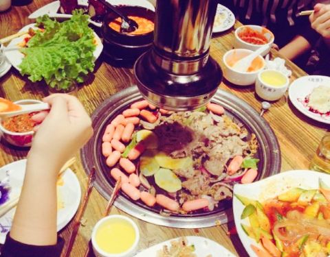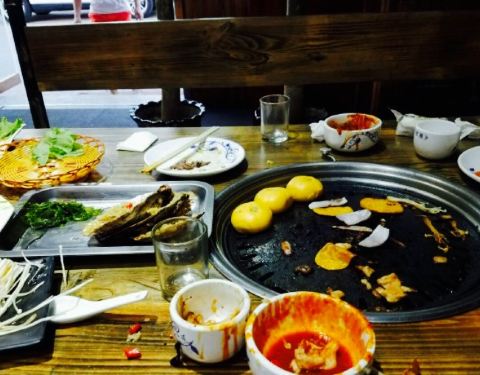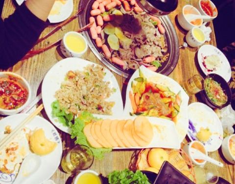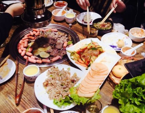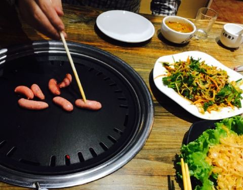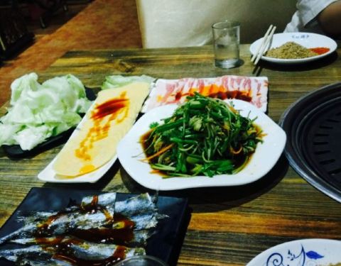 离咸水沽近,庆祝老大晋升选的这家,原本以为是一家韩料馆,其实画风是“最炫民族风”感的东北烤肉餐厅,嘿嘿,性价比还是超高的,四个人吃撑了人均才50,他家以烤肉为主,各种烤肉都可以尝试,鲜拌牛肉,羊肉等等都试过了,肉还是很嫩的,而且油烟并不大,还有烤洋芋,茄子等等,还是烤肉最美味,炸蔬菜必须要赞一个,比以前吃过的炸蔬菜都要好吃,菜的块头很大,并且还炸熟了,红薯很多,很和我们的胃口,还点了凉拌海草和蓝莓山药,中规中矩吧,南瓜饼也一般,还是烤肉和炸蔬菜最美味,服务员偏忙,整体来说性价比很赞。