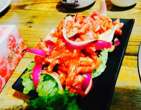 上周末去咸水沽找朋友玩,朋友带着去的,在咸水沽,朋友一直说很入味,其实我本身是个对烤肉不太感兴趣的,可是这家的烤肉味道确实挺不错的。点了两盘牛肉,一份洋芋,一份韭菜,一份生菜,还有捞汁什锦,炒年糕和麻薯甜点。肉挺不错的,切的薄,腌制入味,十分好熟,韭菜和土豆片上也有调味的油,他家的烤盘是不沾盘,所以不用担心肉会粘住。小料是自助式的,有烤肉甜辣酱 。麻酱 。孜然 。辣子面 。芝麻 。花生碎沾料,喜欢烤肉酱,用肉蘸酱然后卷在菜里很可口。总之这次烤肉吃的挺舒服的,特别不错,今后有机会还会再去的。