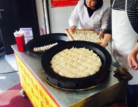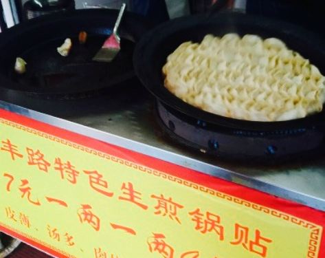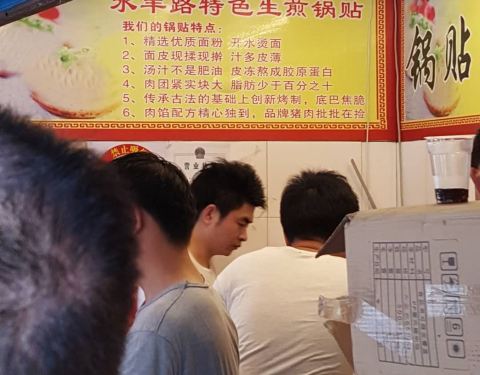 在家附近的,开了最少有十年,最早和牛肉拉面开在一起的,虽然开在一起 。不过买单付钱都是分开结算的。之后又搬到边上弄堂里,只是还是不少人都是牛肉汤,锅贴这样搭配。现在自己借的门脸,就在大名鼎鼎的晶牌烤鸭的旁边。一到双休日那排队的人多的哟,起版要排上半小时,人多时要将近一小时。他家的锅贴特色就是皮薄,馅大,汁多,底脆。不过有时买回去底会和垫着的一张纸粘一起,撕起来比较麻烦,期望能想办法改进下。