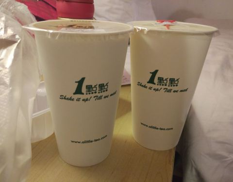 1点点,飞洲国际广场店,走了大半天,窝在床上养养神儿。 随手翻外卖,1点点,N多网友推荐,补一下,下午茶的缺儿。 中杯波霸奶茶,温热,不加料,10元一杯。中杯四季玛奇朵,加布丁,三分甜,15元一杯。 只想说~~茶味十足,还蛮喜欢哒。