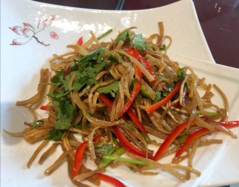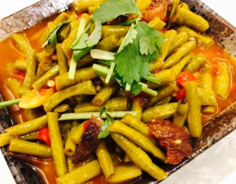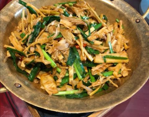 - 这个挺好吃的,也是店里特色菜,笋被撕成条状,跟韭菜炒在一起,有种蔬菜的香气,但徽菜重油重色,所...