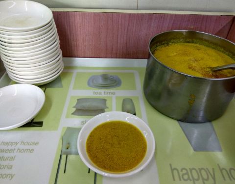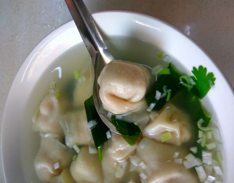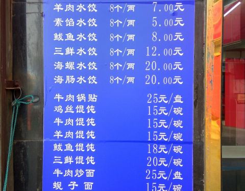 出行前咨询过大连的朋友,问他们早餐一般都吃什么,回答清一色的都是饺子,不同馅料的饺子。于是,到大连的第二天早上,我们还是吃饺子。 从天津街美食街上搬来的马家水饺,一家不知道多少年的清真老字号,就在火车站附近的胜利街上,蓝色的铺面很好找,牛肉水饺是主打。 店铺外挂着各种饺子的价格,里有前后两个厅堂,收银台在后面,最后面是厨房。 点了牛肉水饺,鲅鱼水饺和鸡丝馄饨,鲅鱼是混着菜馅的,不是一口鱼肉的感觉一点也不过瘾。水饺的蘸酱,除了普通的酱醋之外,还有芥末酱,搭配鱼肉水饺吃的。