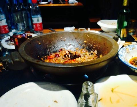 总听朋友说他家好吃,今日终于赶上来一趟。饭馆的装修透露着浓浓的川蜀风格,只是感觉因为是旧楼门市的原因,显得有点陈旧。所谓石锅鱼就是把鱼剁成块,油炸后跟各种配菜一起煮,配菜包括午餐肉,虾,豆芽等。手撕牛肉不错,我们还探讨了一阵肉丝制作的。麻将油麦菜的麻酱属于混调出来的,加了别的东西,味道比较重,本人比较喜欢纯酱的。家常凉菜水平一般,但也不难吃。整体评价中规中矩,还算及格。