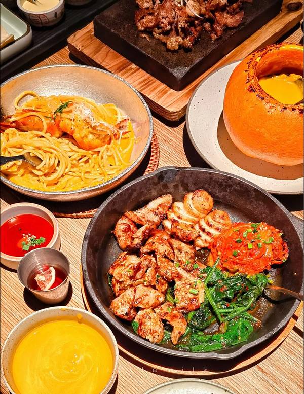 这家韩里韩气的店,也太太太好吃了吧! 我大概已经说过100遍了李教授是我的最爱 每次都疯狂安利给朋友和同事闭眼点不踩雷 浓稠的南瓜粥: 可爱明亮的碗 边边的一圈烤的焦焦的看起来就很有食欲 铁锅猪颈肉: 是让我惊艳的存在 灵魂就是用铁锅的余温烫熟的菠菜和泡菜蒜片酱汁味很浓郁 同款里,个人感觉比番茄泡菜五花肉好吃诶! 烤肥牛: 也是每桌的必点噜 喜欢一个不落的把酱汁全放在饼皮上即使这样也掩盖不住热fufu的肉香哦! 意面里我比较爱有一丢丢辣的明虾奶油意面 感觉比面包鸡肉款的好吃口感层次会更丰富一些 餐前餐后的小饮料也是YYDS 疯狂推荐玄米茶以糙米为原料 既有茶叶的自然香气又有炒米的芳香