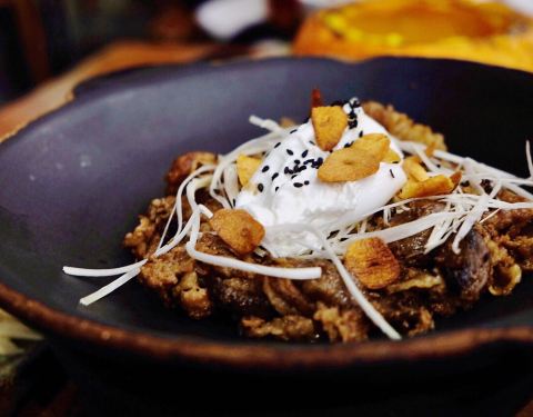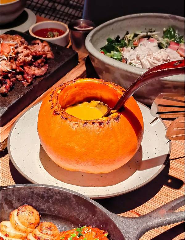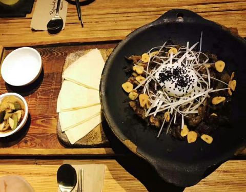 这家刚刚开张的时候有看到点评有试吃,还很高兴的报名,可是不知道为什么,我再也无缘点评的霸王餐活动,从来就没中到过啊,朋友圈看到有朋友中了试吃,每道菜都看上去好精致了。 环境:|★★★☆| 这家在K11里面,可惜啊,里面实在太暗了,暗的我差点要从楼梯上摔下来的感觉啊,求店家把灯弄亮一点可以么……因为实在太暗,所以我也没有注意到里面的装修到底是什么样的。 服务:|★★★★| 这家其实服务还可以,可是暗到有些地方根本看不到,不过很庆幸的事,我之前吃过另外一家叫倍乐的,那家也是同一个老板,听说老板很帅,然后上次没有见到,这次很庆幸的在黑暗之中见到了老板,老板说等会就会有人点单,虽然是蹩脚的中文,但帅的真的是好看呀。 口味:|★★★★☆| #直火碳烤肥牛# ¥88 |★★★★| 肥牛的味道很好吃,太阳蛋放在中间把他拌在牛肉间,很好吃,加上旁边的饼再沾上酸奶的时候,感觉很好吃,牛肉虽然不能说上特别嫩吧,不过也算是不老,而且入味,所以就算不加饼不加酸奶,也非常好吃。 #黄金南瓜粥# ¥68 |★★★★☆| 其实大多数的韩式料理店里,都会在开胃菜的时候送上南瓜粥,他们家却把南瓜粥当作一道菜,售卖给别人,如果做不出一番心思,我想会被骂到变成配菜吧,上来的时候,一大个南瓜放在你的面前,里面看似普通的南瓜粥,却还加上了一点奶油,这不是点缀,这是点晴之笔,服务员会提醒你,在搅拌南瓜粥和奶油的同时,请将南瓜上面的一同搅拌,一开始你不知道这是何意,当你在搅拌的时候你就会发现,南瓜肉就像有一种魔力,再搅拌时自动脱落,搅拌均匀后,你吃下去,这不是南瓜粥,这就是南瓜,奶油南瓜粥的滋味,真的不得不说好有魅力哦。 #精炖菜包肉# ¥98 |★★★★☆| 这道菜我没有看推荐,凭直觉点的,不过我的直觉好像还不错的样子,上来的量虽然不是特别的多,但每一口都是那么让人满足。有种小入口即化的感觉,虽然肥肉也很多,但却一点都不觉得他腻,口感虽油,但却满足。三种酱,却是泡菜酱最不辣口,各有各的特色,包完生菜,可以包洋葱,别有一番滋味哦。 #韩式辣酱炒活章鱼# ¥128 |★★★★| 除了菜包肉,我全部是点大家推荐的,当然我本身就爱吃章鱼,所以也是一点私心,虽然有点小辣,但真的很够味,我吃不出他到底是不是活章鱼,但那个嚼劲是很好的,我很喜欢。感觉在吃韩国创意菜的同时,又回了韩国的本身,没有离开这个韩式的主题。 #意式墨鱼汁芝士饭团# ¥68 |★★★| 这是本店第二推荐,但却