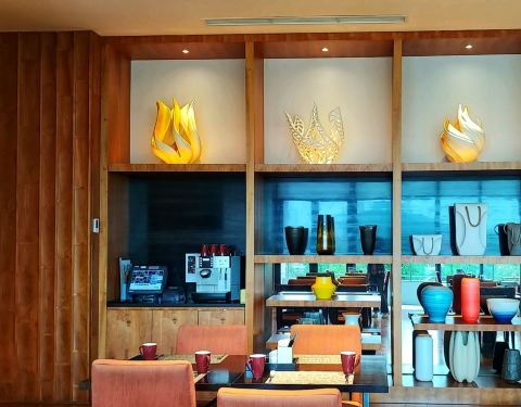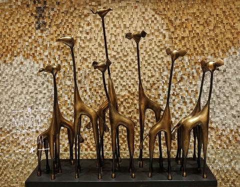 在万豪酒店的2楼。 【环境】 餐厅面积蛮大的,有各种各样的座位有沙发坐啦卡座啦,还有落地窗边阳台边的座位,满足各种需求。阳台大落地窗边的座位风光还是不错的,远眺可以看到的大海。 【菜式】 早餐品种很丰富啦,中西餐俱备。常规的煎蛋啦面档啦之外还有广东的粥品,还有地产酸奶和乳酸菌饮料,甜品还有黑芝麻糊。感动! 【服务】 服务生都很主动热情,有带位服务。 电梯间的长颈鹿组图小雕像太可爱了!