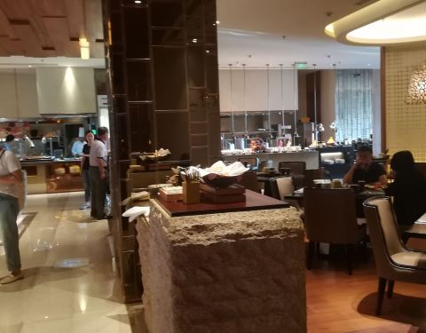 在万豪酒店的2楼。 【环境】 餐厅面积蛮大的,有各种各样的座位有沙发坐啦卡座啦,还有落地窗边阳台边的座位,满足各种需求。阳台大落地窗边的座位风光还是不错的,远眺可以看到的大海。 【菜式】 早餐品种很丰富...