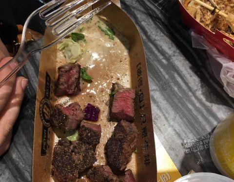 肉是好肉,做的也挺地道的,但就是环境太差了,几张小餐吧台,这都能忍,最不能忍的是餐具,竟然是塑料叉子,而且最最不能忍的是牛排居然被他切成小块儿放在纸的小托盘里就送给你了,完全没有吃牛排的感觉了,媳妇儿说,感觉就像吃一个牛肉的感觉。