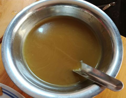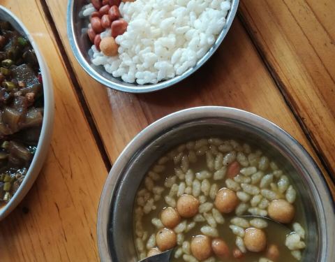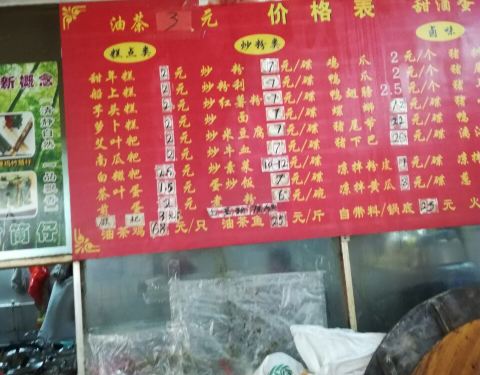 来桂林如果要吃油茶的话我会选择这家开在菜市旁边的老店,地点就在解放西路阿甘酒家旁边巷子内,店内的环境很一般,典型的路边摊,一般都是当地人来吃的多,价钱还是惊人的便宜实惠,分量很足足。来这里一定要点上他家的白糍粑,配上半融化的半糖,表皮煎得很香,吃起来香甜软糯,而油茶据说也是非常地道的恭城口味,一碟脆果炒米花,样样放一点加盐或糖,淋上滚热的油茶,就着糍粑或者他家的年糕,别有风味。