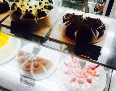 这家店的蛋糕做的精致又美味,有些蛋糕还有针剂插在上面,有些呢是巧克力勺子装饰在上面,可以买单片也可以买整只的,单片的价格35-45不等。