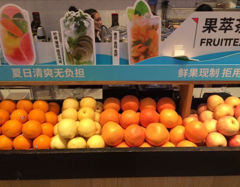 炎炎夏日,逛商场也成了蹭空调的一种选择。如果能再加杯给力的畅爽的饮品,就更惬意了。 闲逛于泊富,被这家店吸引,店面不大,操作区和休憩区左右分隔,操作区前面摆放这新鲜诱人的水果,从忙碌的店员状态来看,这里的饮品原材料是相当有保证的,明档操作一切都在眼里。点了一杯西柚柠檬桂花乌龙,虽然26的价格有点略贵,但是味道还是比较满意的,特质的杯子也非常有质感。