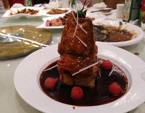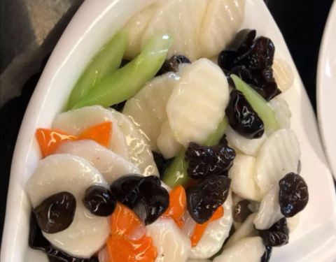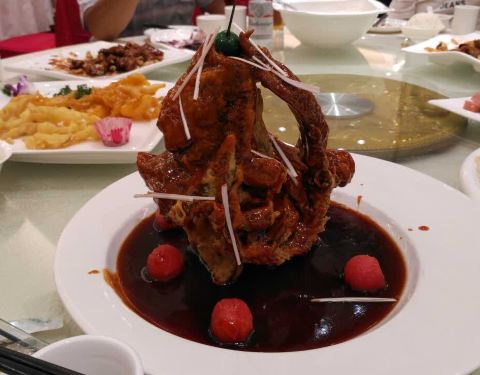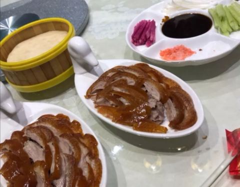爆三样,不油不咸,口感嫩,蒜略多,刚上桌的时候好好吃。 咸蛋黄豆腐,用的是嫩的北豆腐,不咸,颜色很到位,味道也还行。 中芹木耳山药,还行,不错。 烤鸭,鸭子肉挺好吃的,很不错。