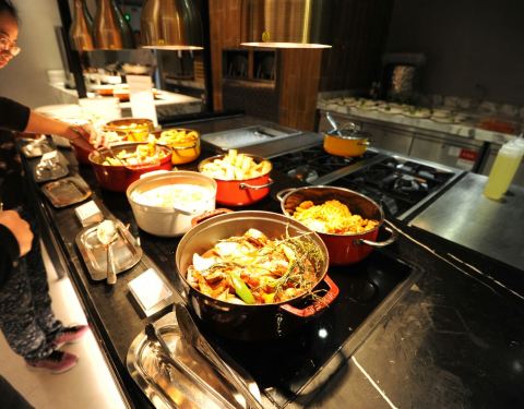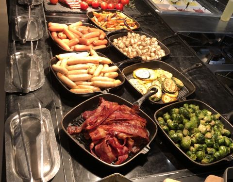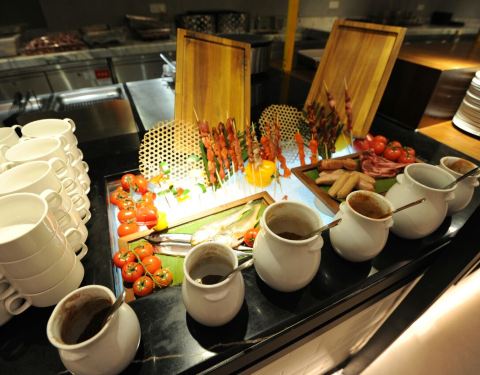 在七宝宝龙艾美酒店一楼的新食谱全日餐厅,是一间专吃自助餐的西式餐厅,最近的地铁站是9号线七宝站,不过也要步行一段路。这餐厅的环境不错,很宽敞,有沙发座位,用餐感觉舒服。这里的特色是有小火锅,但是食材不多,一共只有十种左右,最抢手的应该就是肥牛片了,其他都是普通食材。其他的推荐菜有羊排和牛排……特色就是各有两种烹饪法,五分熟跟全熟。个人还是比较喜欢五分熟,没有全熟的那么老。海鲜冷盘跟甜品还可以的。热菜的选择很少,主食只有炒饭和炒面(但炒面不行)。饮料有咖啡、西茶、软饮、果汁以及雪花生啤……生啤是畅饮的哦!对这里最满意的地方就是服务员的态度,很认真 很勤快!