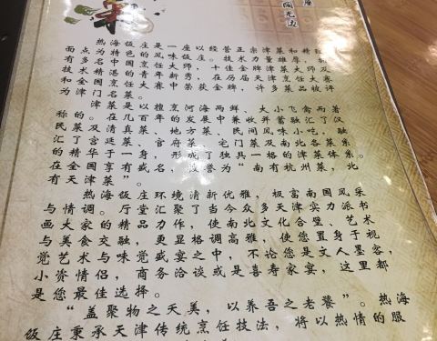 热海饭庄,天津传统菜,真材实料,味道不错,很有特色,基本上口味跟红旗饭庄差不多,适合宴请,还有传统家庭的聚会。特别的好吃!!推荐!!