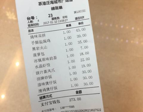 同事聚餐,虾饺,盐焗鸡,凤爪非常不错,炒饭,煲仔饭味好量足,环境好。4人273元。