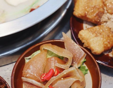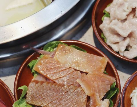 - 每一样食材都很新鲜,在骨汤鸳鸯锅里涮两下,配上油碟味道特别香。之前有吃过一次,所以点单也是熟门熟路