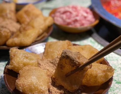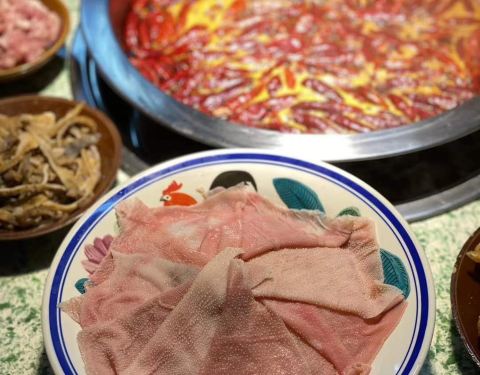 之前有吃过一次,所以点单也是熟门熟路。血毛肚、千层肚、鲜鸭血、嫩牛肉、耙牛肉、鲜牛脊髓、火锅牛排、重庆滑肉片、午餐肉、贡菜丸子、鱼籽虾滑那是一样不少,整整齐齐地装在盘子里端上桌。每一样食材都很新鲜...之前有吃过一次,所以点单也是熟门熟路。血毛肚、千层肚、鲜鸭血、嫩牛肉、耙牛肉、鲜牛脊髓、火锅牛排、重庆滑肉片、午餐肉、贡菜丸子、鱼籽虾滑那是一样不少,整整齐齐地装在盘子里端上桌。每一样食材都很新鲜,在骨汤鸳鸯锅里涮两下,配上油碟味道特别香。 小酥肉和红糖糍粑当然也必须要有,我还点了份醪糟冰汤圆和红豆冰稀饭,到底还是冰镇的食物过瘾呀!