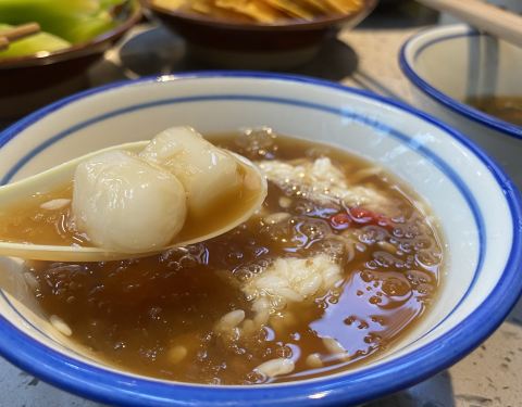 之前有吃过一次,所以点单也是熟门熟路。血毛肚、千层肚、鲜鸭血、嫩牛肉、耙牛肉、鲜牛脊髓、火锅牛排、重庆滑肉片、午餐肉、贡菜丸子、鱼籽虾滑那是一样不少,整整齐齐地装在盘子里端上桌。每一样食材都很新鲜,在骨汤鸳鸯锅里涮两下,配上油碟味道特别香。 小酥肉和红糖糍粑当然也必须要有,我还点了份醪糟冰汤圆和红豆冰稀饭,到底还是冰镇的食物过瘾呀!