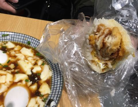周末的早上九点钟,居然没怎么等,但是吃好刚出来门口就排长队了,看来周末大家还是睡懒觉的多,哈哈。 早餐高峰小小的操作间少说也有七八个人在工作,收银的、盛豆花的、包饭团的……各司其职,倒也有序。 门口先买好单到室内取,完全敞开式的操作间,看着师傅一点点把饭团捏起来,倒也干净放心了。 咸饭团里加了肉松和蛋黄,真的好好吃,北方始终吃不到满意的恣饭团,不开熏(⌒▽⌒) 咸豆花也很满意,比较喜欢这种传统口感的。真的受不了那些勾芡的、加麻汁的……等等等等……还是喜欢这种老味道