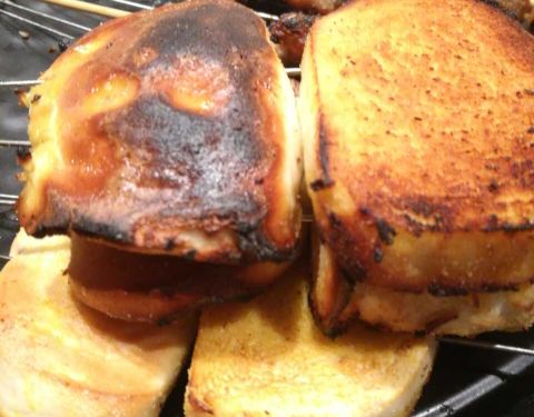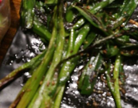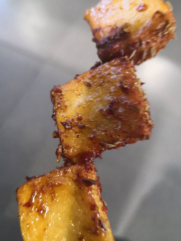 串一般,馒头片烤糊了,韭菜也烤糊了,豆腐丝还没撕开
