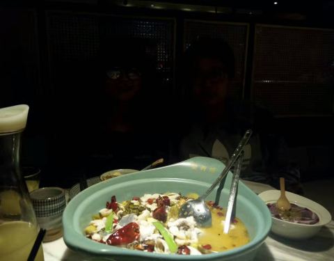 和闺蜜2月份去扫的一家店了,酸菜鱼我喜欢的呀! 我先来说说搞笑的呀,就是让服务员帮我们拍照,结果拍出来下图,嗯~把菜拍的可清楚了,人就……囧,总算选出两张能看到人型的发了朋友圈,被好朋友们笑疯了,囧啊...