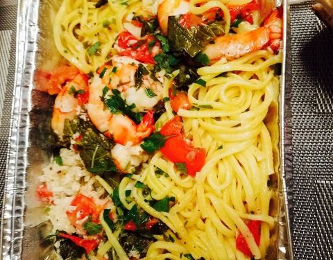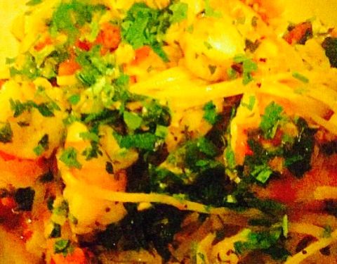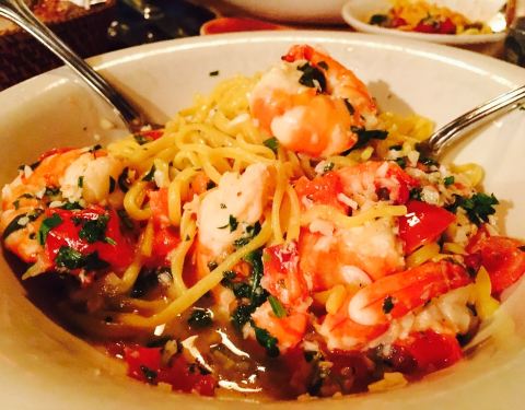 Shrimp scampi with garlic, parsley, and tomato in a white wine sauce over linguini