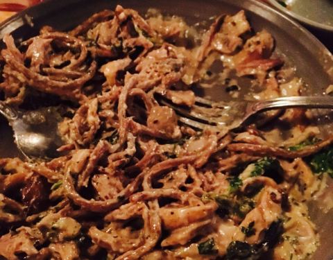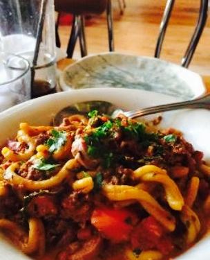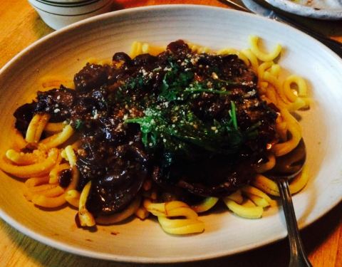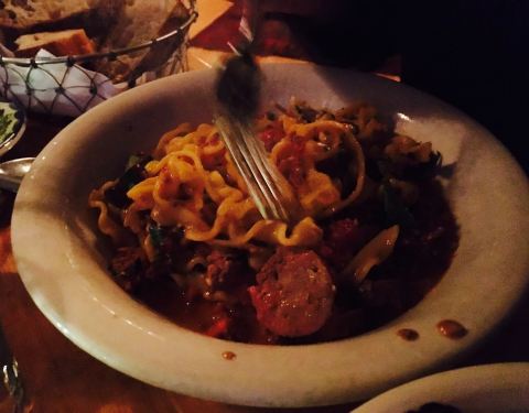 Bolognese of beef, sausage & mushrooms over tagliatelle