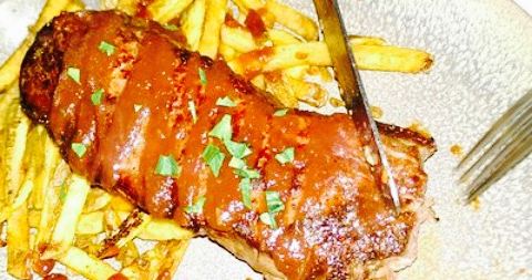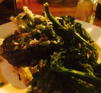 Bone-in ribeye* with a bacon and gorgonzola frittata, sautéed broccolini, and chipotle catsup