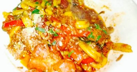 Braised chicken with vinegar peppers, tomato, and mushroom tossed with fusilli