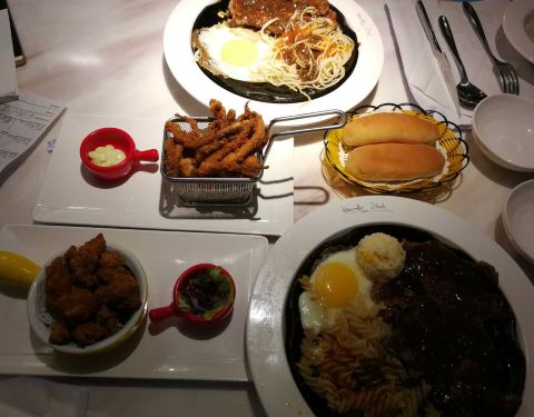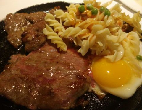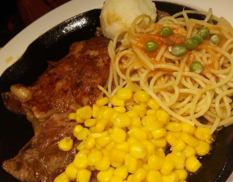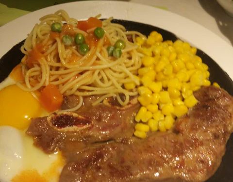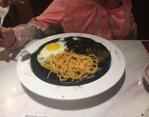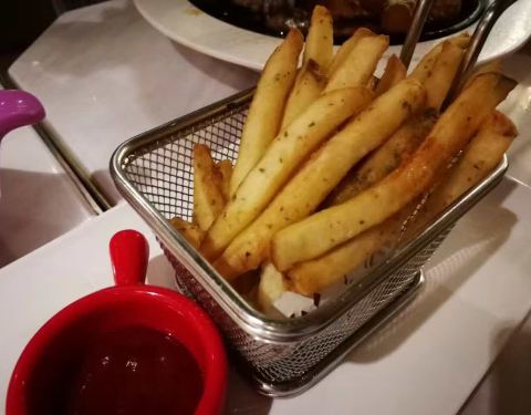 在新城市四楼,点了红酒牛排,肉块比较小,肉味不浓,比较一般。玉米汤也比较稀,自助沙拉和水果还可以。餐前包也不错。炸薯条火候略大,有点干了,不够脆