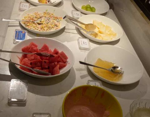 - 餐前包也不错。炸薯条火候略大,有点干了,不够脆。玉米汤也比较稀,自助沙拉和水果还可以