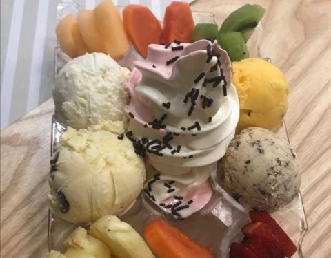 ...…22颗冰激凌球,加上一圈水果…人民币大概300多一个,越大越贵,两个人也根本吃不完,选择放弃