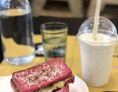 No Milkshake No Life 黐线芝士黐住芝士治78,因为是即点即做,基本每张桌子都会叫,所以要等15-20分钟,闻着香味超级饿的。红菜头面包烤得外脆内软,边边稍微有点硬,表面撒了椰丝和罗勒叶。芝士分量真的非常多,芝士味浓郁,拉丝满分,里面还加了香草酱!因为我本来对这个的味道没什么期待的(毕竟这种一般都是颜值比味道好),虽然不少人觉得比较普通,但我觉得还挺不错的。 早餐会牛角包65,这个牛角包里面有流心蛋、烟肉、芝士、蔬菜和番茄。牛角包烤得很酥脆,口感非常丰富,番茄和蔬菜让整个吃起来没那么腻,喜欢! 饮料方面虽然大家必点milkshake,但我们实在是怕腻,点了个热情果soda45,可惜太甜了,下次一定要试一下奶昔!