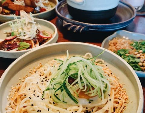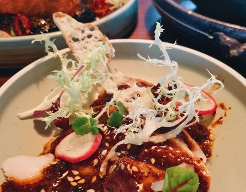 Birds of a Feather是一间主打川菜的西餐厅,完全西式的装潢和环境,但却可以在这里认认真真的享受美味的川菜,中西文化透过美食完美交融。Red Birdie Noodle红油小面20新币,非常精致的摆盘,面条比较筋道蛮有嚼劲,红油的香味配上黄瓜丝的清爽,味道还是令人愉悦的。辅料有一盘黄豆、葱花和香菜,根据个人口味添加,还配了一盘鸡片,淋上满满的辣椒油,小面自己也没想过有一天会变得如此精致吧。缺点就是小贵,性价比略低,毕竟颜值再高他也只是一碗小面。Fortune Skewer in Sichuan Pepper Broth20新币,其实就是所谓的钵钵鸡,属于前菜,里面有虾、花椰菜、土豆片和魔芋等,味道还算比较正宗,麻麻辣辣挺开胃。缺点依旧略贵。Baked Eggplant14新币,类似改良版的鱼香茄子,除了摆盘独特以外,味道也是酸甜可口十分特别,配上油炸馒头和特制的酱料,很是美味。除了川菜,他家也有西餐,Bird’s Signature Burger35新币,是人气比较高的菜品之一,其中的鹅肝真的是相当肥厚有质感,旁边还配上了一些烤紫薯和土豆皮,撒上些许辣椒粉,很川味。饮品的选择也是多种多样,我们点的海盐冰淇淋咖啡和Angry Bird都很不错,颜值高口感也好。我们是午饭时间来的,提前预约了座位,靠近吧台,灯光很昏暗,越往里走越宽敞,天井的地方阳光洒下来,可以说非常的美好了。