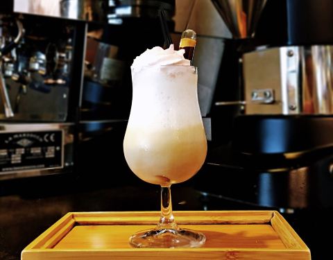 ᴍᴇʟʟᴏᴡᴇʀ ᴍᴀʏ 马六甲椰糖咖啡冰沙,挤上新鲜搅打奶油,再撒上椰糖酱和椰丝。 第一口直接喝,清甜绵密的奶油,带着扑鼻的椰香,还能一起喝到冰沙,有那种奶盖茶的丰富口感。 试管里是深度烘焙的苏门答...