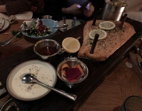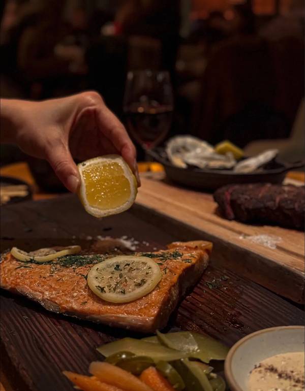 现点现烤,摆盘精致,上桌就被惊艳到了,三文鱼经过雪松木的烤制,呈现出独特的香气和味道。鱼肉鲜嫩多汁,滴上柠檬汁,搭配特制的酱料,口感十分丰富。