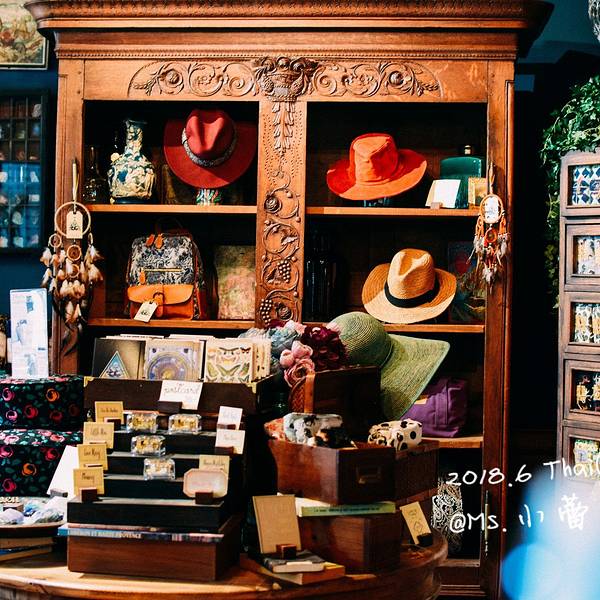 这家餐厅在曼谷是家小有名气的餐厅,点了一波美食,除了这个猪勒排,我觉得都挺好吃的,据说这里的饮料是特色。苏打水冰块里会有花瓣和水果,把爱丽丝梦游仙境般的小药水灌倒进去会变色发光的那种,因为室内冷气十足,还是换了热腾腾的奶油汤。店铺的一部分也用来作为买手店,各种特色的手工帽子买两顶还挺有纪念意义的。